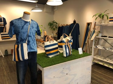 店舗では、洋服、アクセサリー、バッグなどのshimaaiオリジナル商品を販売。藍染×フクギ染のコラボレーション「クリエイターズ トートバッグ」が人気。