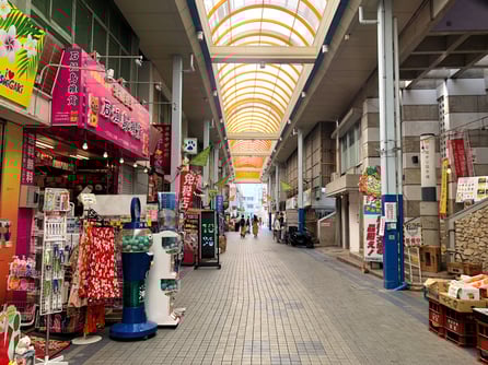 離島ターミナルから徒歩で行ける「ユーグレナモール」でショピングを。お土産屋さんから市場、島オリジナル商品のお店など、様々なお店があるので便利です。アーケードがあるので、日差しが強い日や雨の日でも安心です。